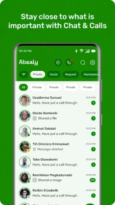 Abaaly shine mafita ga waɗanda suka gaji da yawaitar manhajoji a wayarsu, yana tattara muku komai a wuri guda don sauƙaƙe rayuwar ku ta dijital. Manhajar tana ba da damar sadarwa mai tsabta, mai sauri, kuma mai cike da annashuwa. Ko kuna tattaunawa da mutum ɗaya ko a cikin rukuni, za ku iya musayar saƙonni, saƙonnin murya masu tsawo, da kuma hotuna ko bidiyo ba tare da raguwar inganci ba. Kiran murya da na bidiyo a Abaaly suna da tsabta sosai kuma an gina su kai tsaye a cikin manhajar, suna tabbatar da cewa duk tattaunawar ku ta kasance mai sirri da kariya ta rufa asiri tun daga farko har ƙarshe.