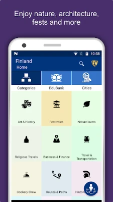 Manhajar Finland Country Guide tana rufe fannoni masu yawa, tun daga masu sha'awar fasaha da tarihi, bukukuwa, zuwa abubuwan ban sha'awa na yanayi, wuraren tsarki, dabbobin daji, har ma da al'adun abinci da harshe. Daga cikin manyan fasalolinta akwai bayanin hanyoyin sufuri kamar jiragen sama, tituna, jiragen ƙasa da ruwa don tafiya mai sauƙi. Zaka iya bincika rayuwar daji, koyon girka abinci mai daɗi na gida, samun labarai na yau da kullun, da kuma adana duk abubuwan da kafi so a cikin EduBank. Bugu da ƙari, akwai littafin magana don koyon jumloli na asali na Finnish, da kuma bayanan gaskiya masu ban sha'awa. Dukkan waɗannan sassa na manhajar sun sa Finland Travel & Explore ta zama cikakken jagoran balaguro a Finland, inda tafiyar kama-da-wane zata iya zaburar da kai ga tafiya ta gaske.