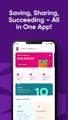 Jollof+ yana ba da zaɓin ajiyar kuɗi iri-iri don dacewa da kowace buƙata. Akwai tsare-tsare guda huɗu masu sassauci: JollofLock, Ajo savings, BabyBox, da kuma JolloFlex savings. Ko kana son adana kuɗi na dogon lokaci ne ko na ɗan gajeren lokaci, Jollof+ yana nan don taimaka maka. Tsaro shine fifikonmu na farko, saboda haka mun aiwatar da fasahar boye bayanai ta zamani don kare bayanan sirrinka da na kuɗinka. Ka tabbata cewa bayananka suna da kariya dare da rana, yana ba ka kwanciyar hankali yayin da kake mai da hankali kan haɓaka ajiyarka. Jollof+ yana da lasisi daga Babban Bankin Najeriya (CBN) kuma NDIC ke ba shi inshora.